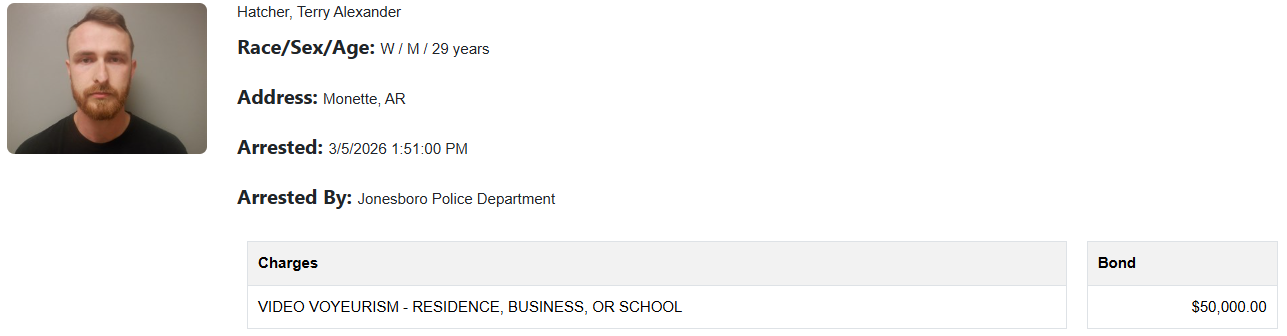 According to the online jail roster, Hatcher was arrested on March 5. He appeared the following day before Circuit Judge Barbara Halsey, who found probable cause to charge him with video voyeurism (residence, business, or school), a Class D felony.